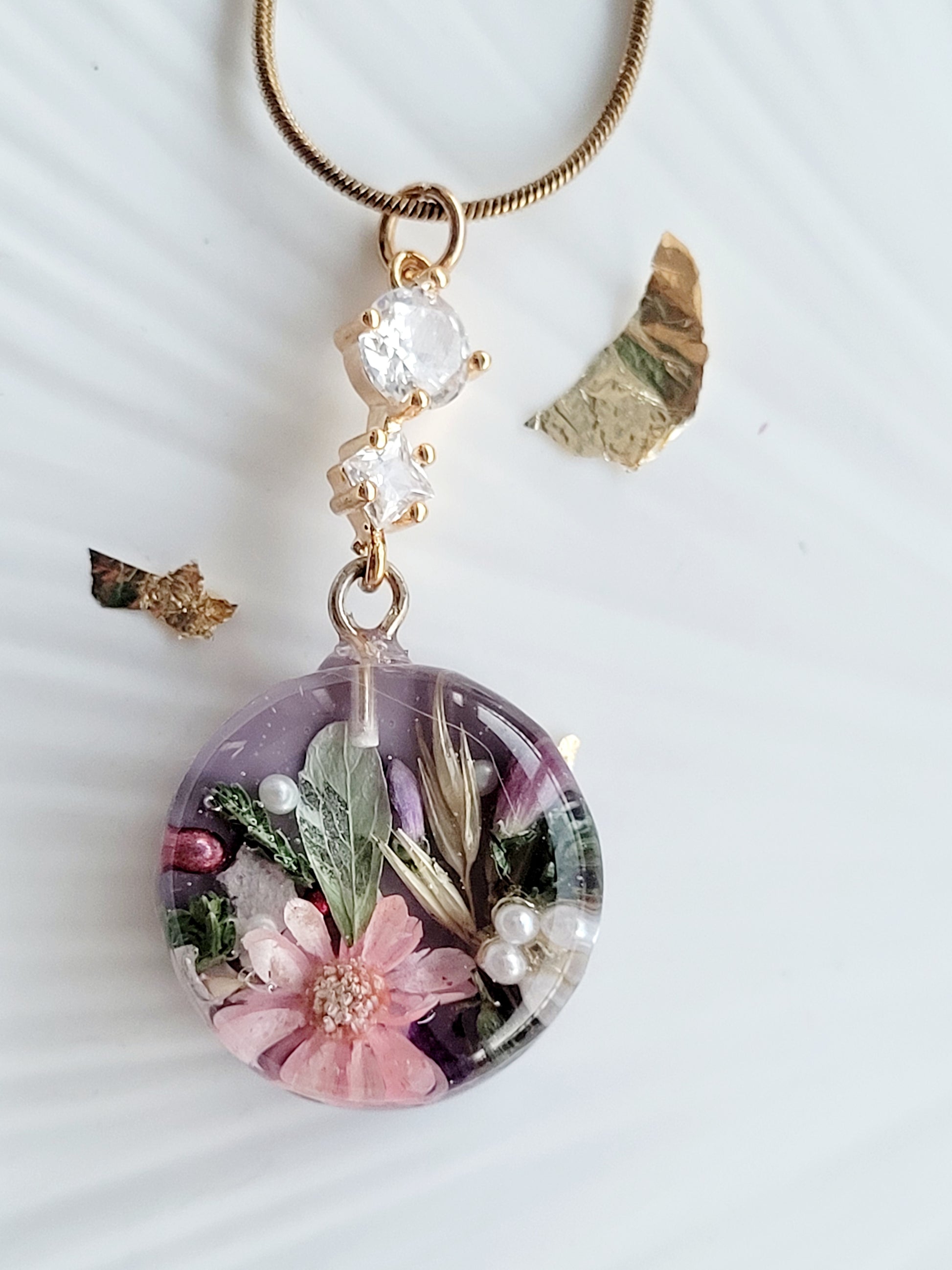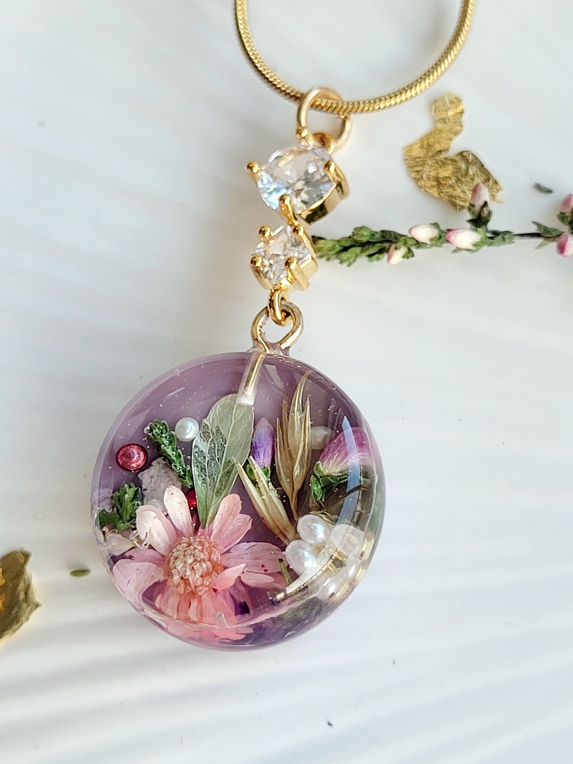 This round pendant holds real wild flowers, soft white pearl flower blooms, and tiny green leaves — all carefully arranged and forever captured in time. Each detail inside is natural and one of a kind.