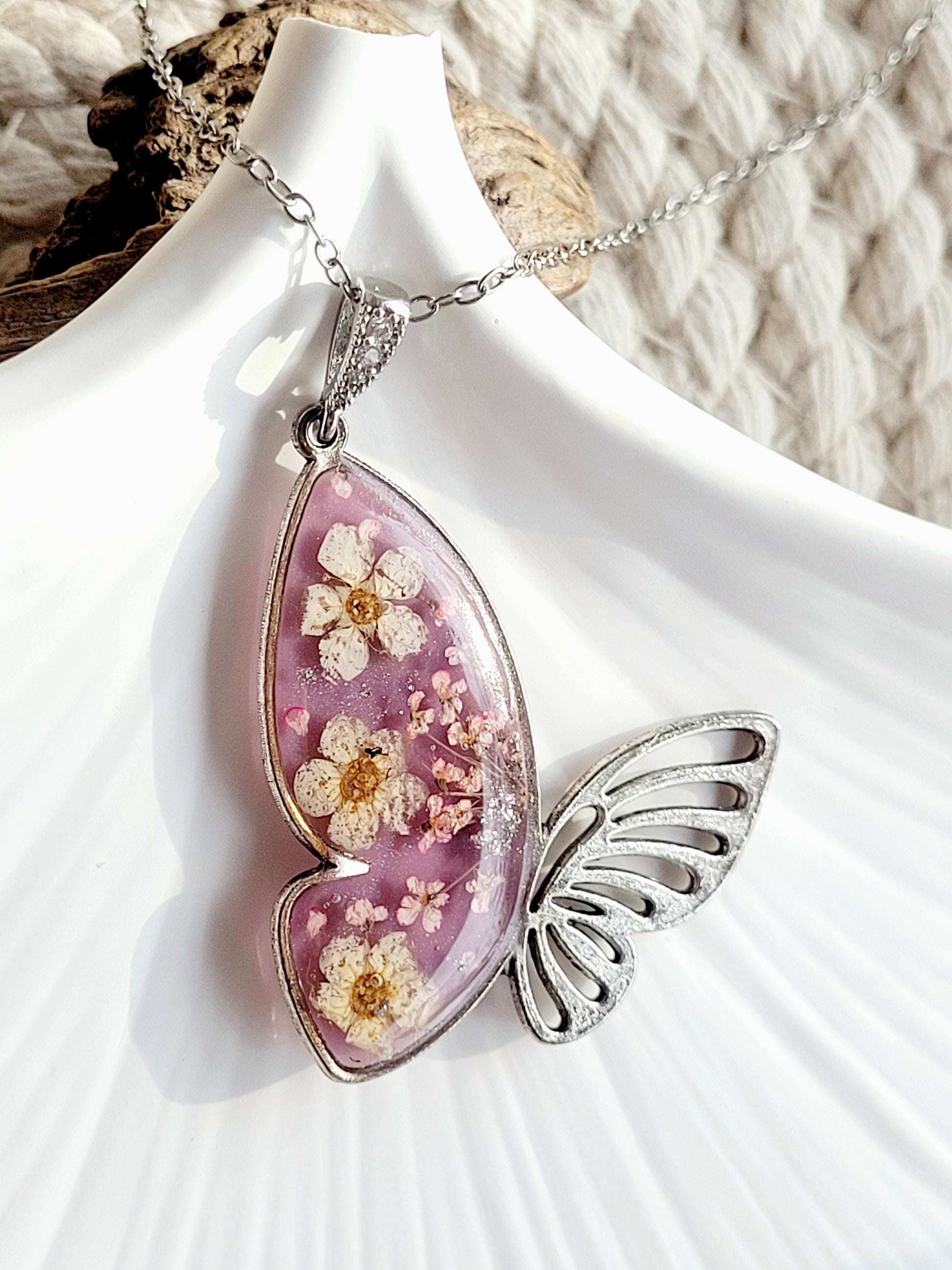 Botanical, handcrafted white and pink butterfly necklac with genuine flowers. Unique gift