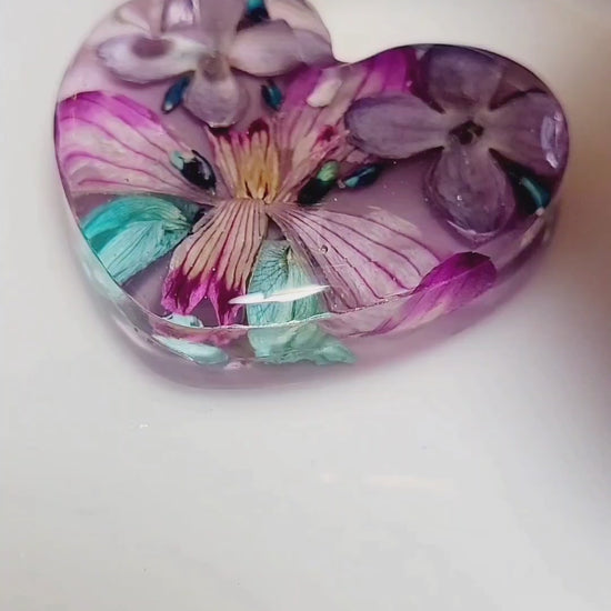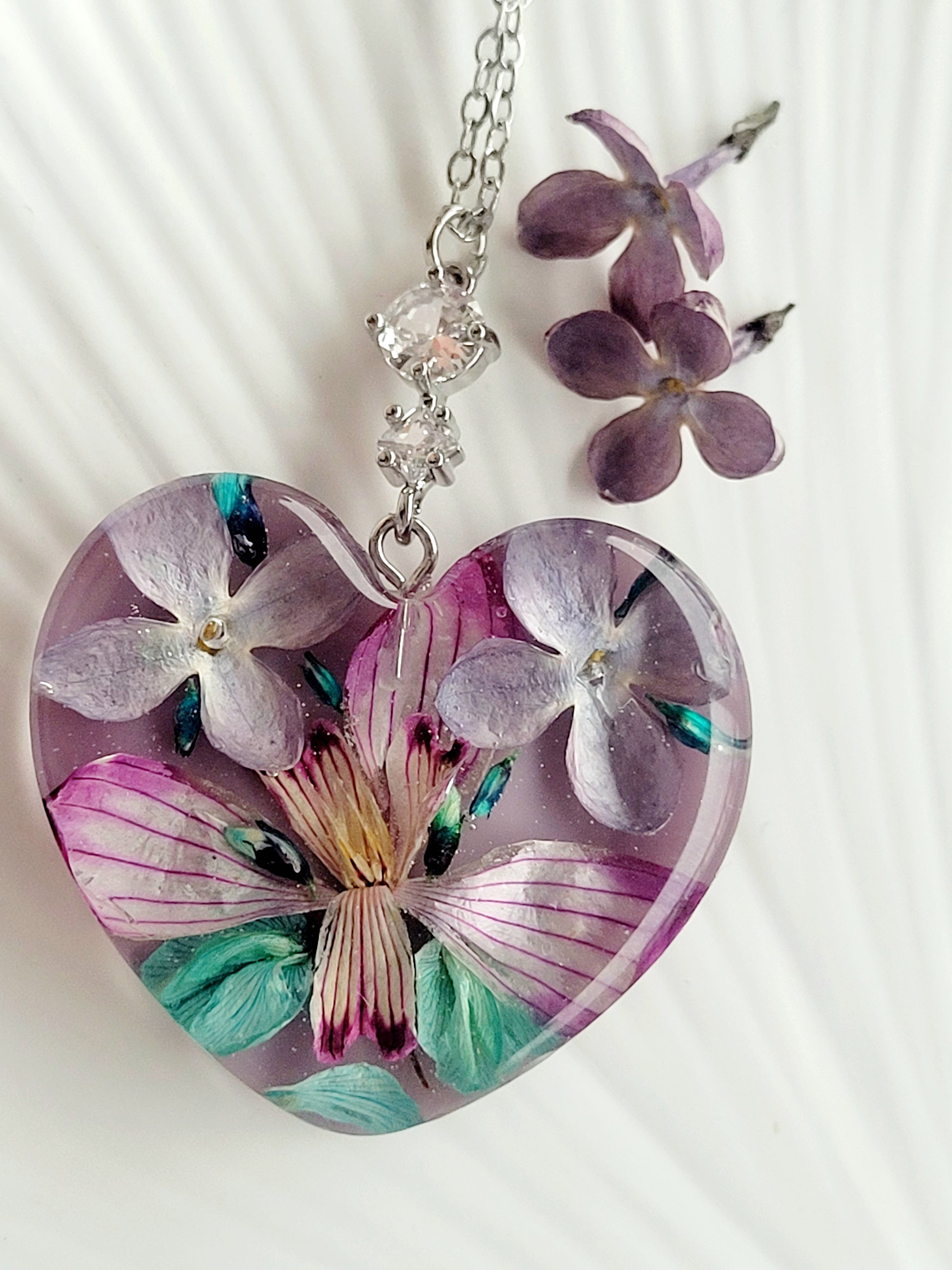 Floral handcrafted heart necklace with genuine snowdrop and lilac flowers