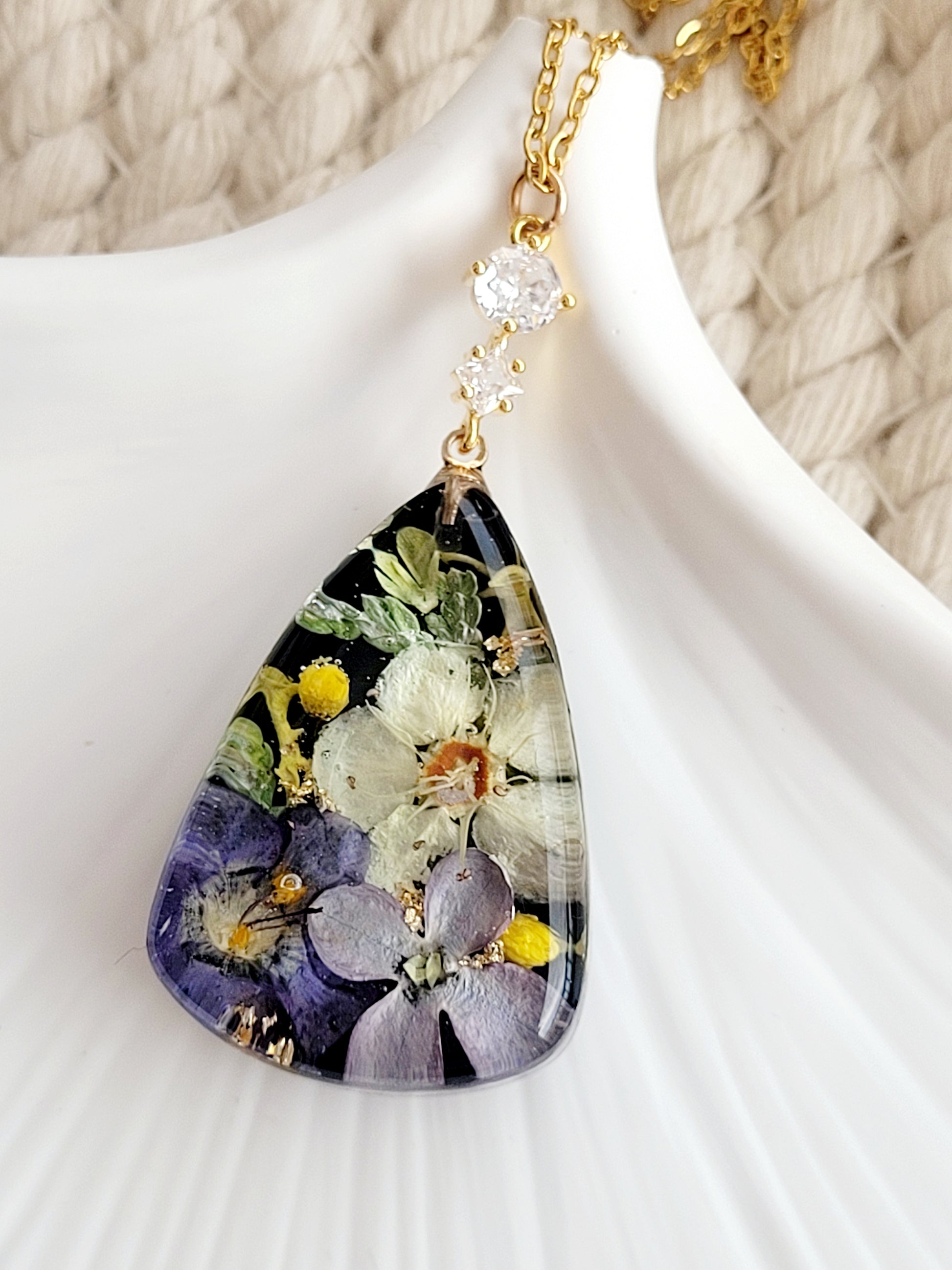 This handcrafted botanical necklace features real crabapple, lilac and wildflowers, collected from gardens of Alberta, preserved in resin to keep their natural beauty alive.