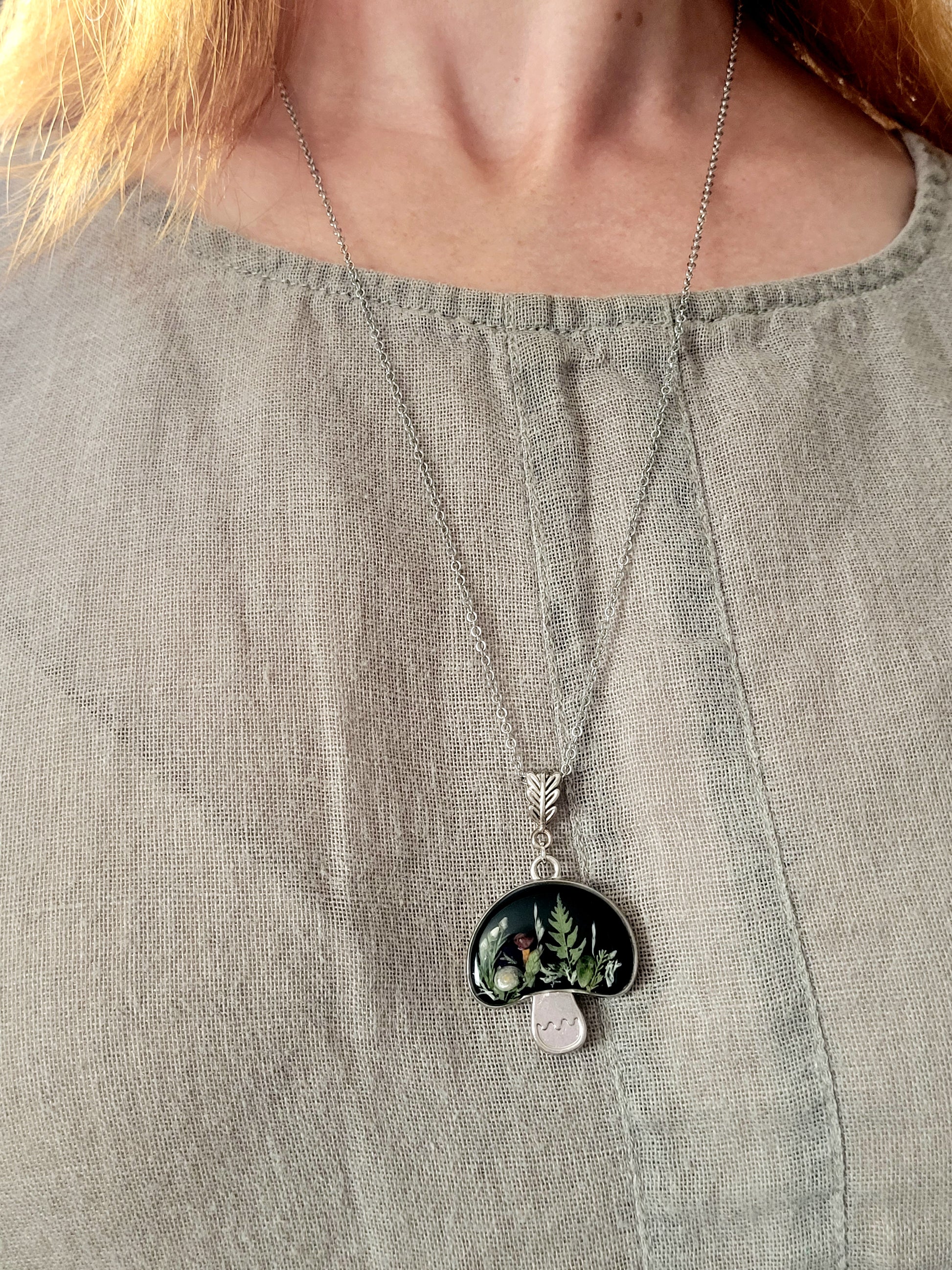Botanical, handcrafted mushroom necklace with genuine fern and snail shell. Mothers day gift. Giftf or her. Unique Gift. Cottage core jewelry