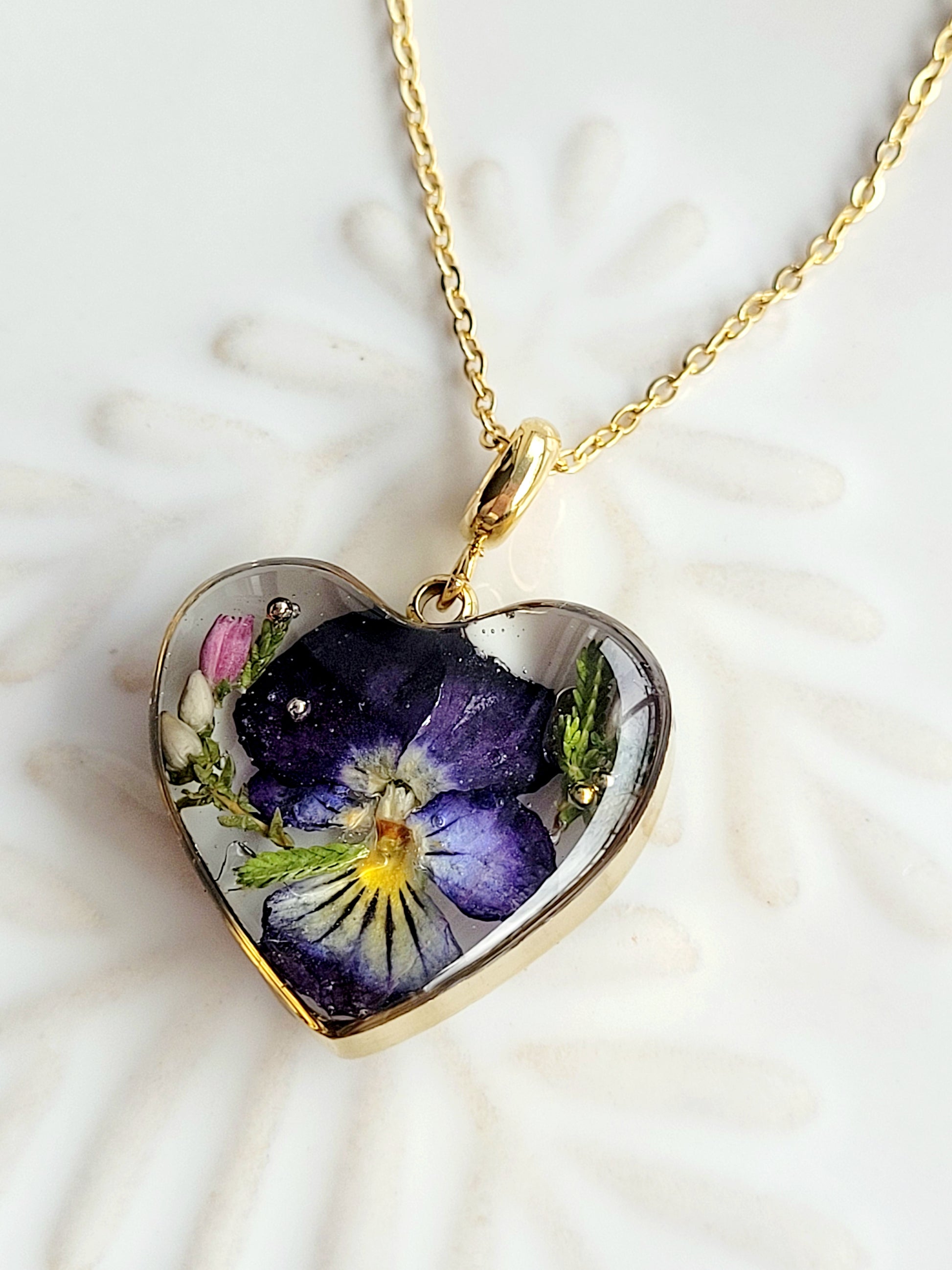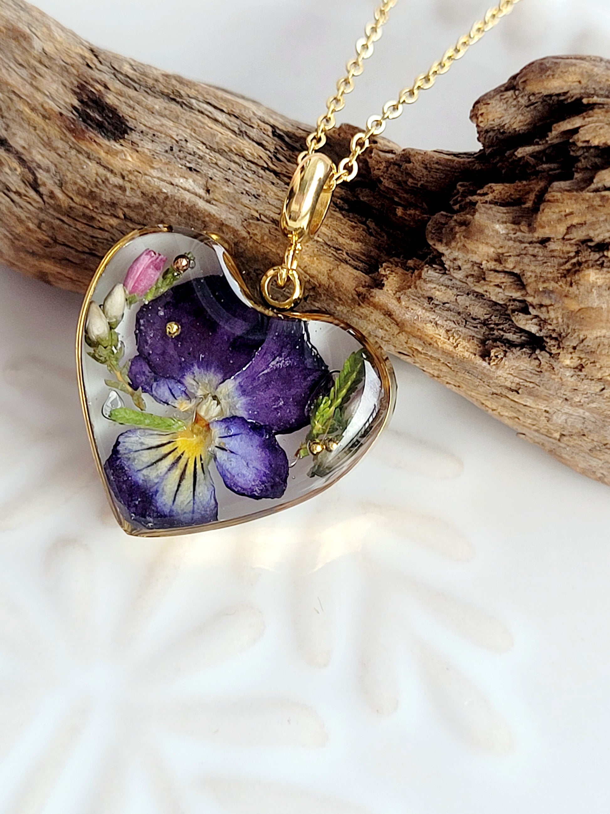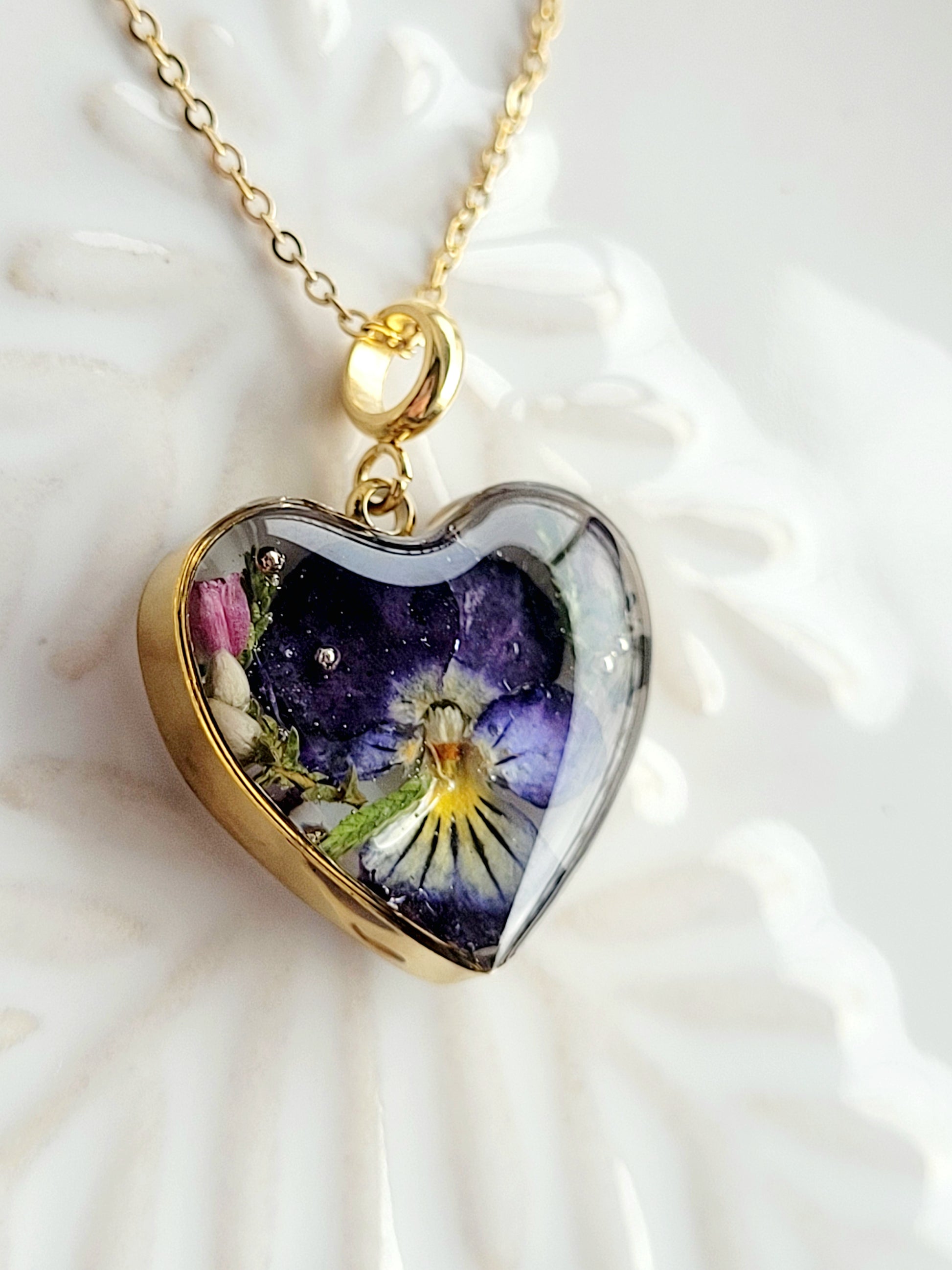 Real Pansy floral necklace. This stunning necklace features a heart pendant adorned with real flowers, making it a unique and thoughtful gift. Crafted with a stainless steel hypoallergenic chain, it measures 20mm x 20mm and includes an 18" extension.