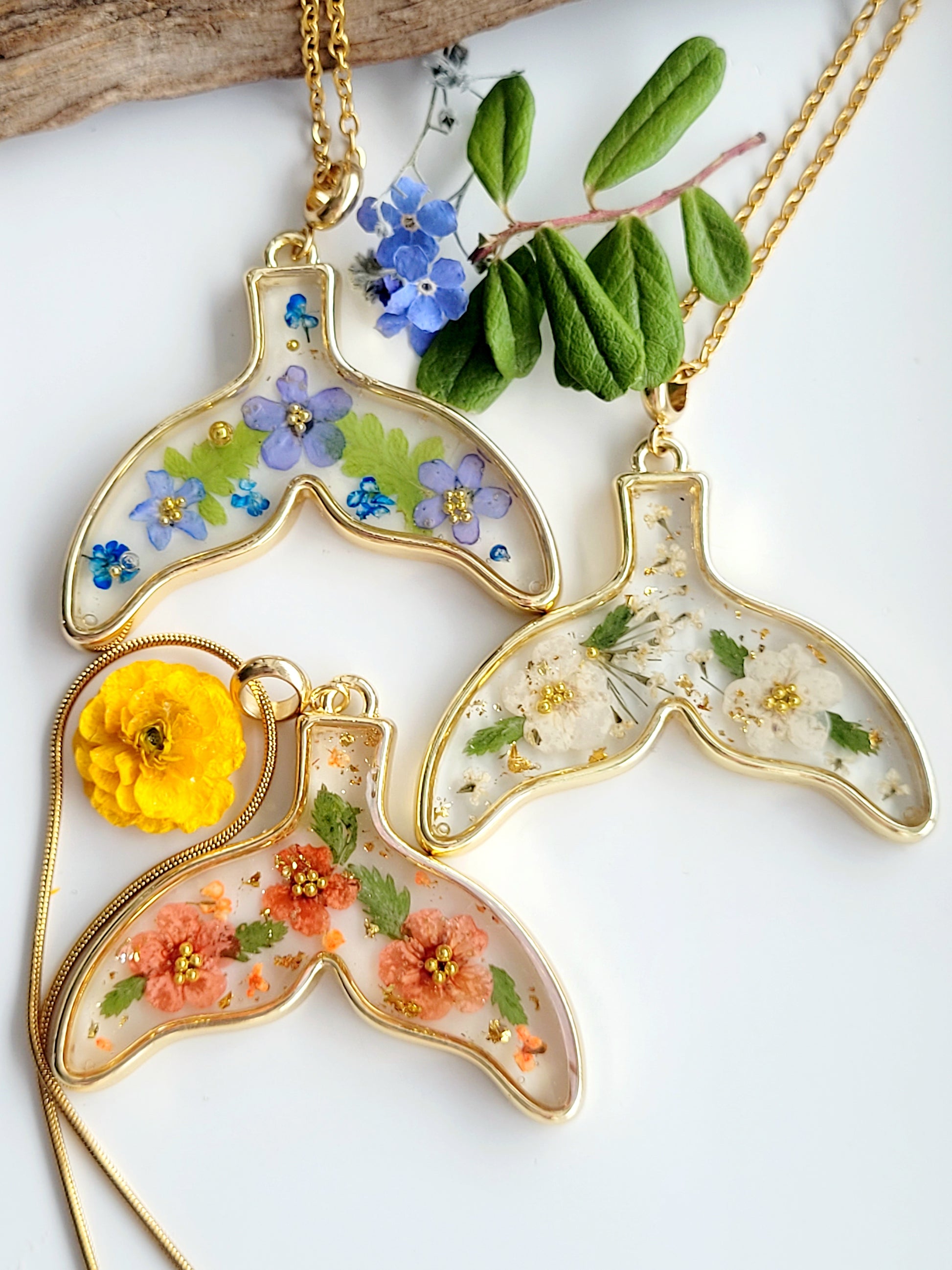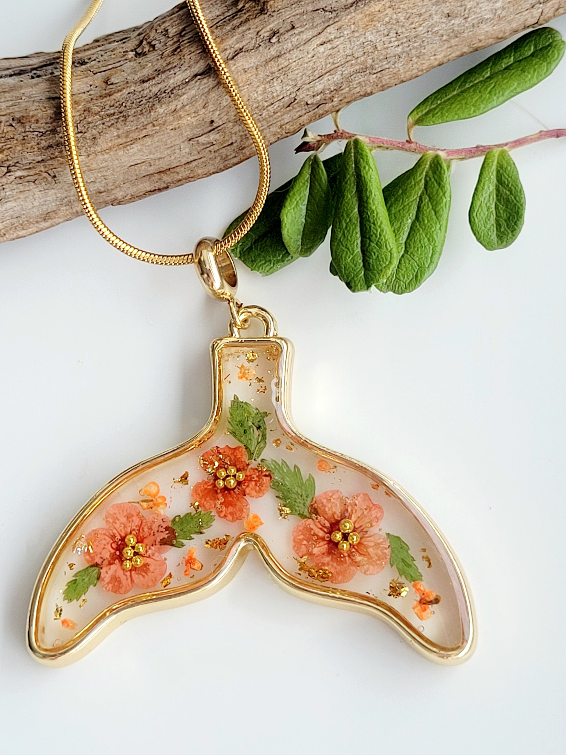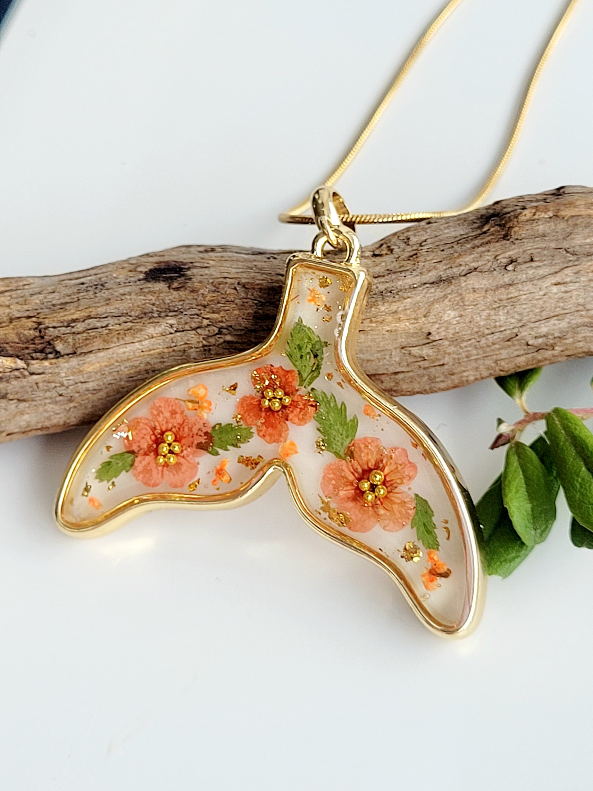 Botanical handcrafted whale tail necklace with genuine flowers
