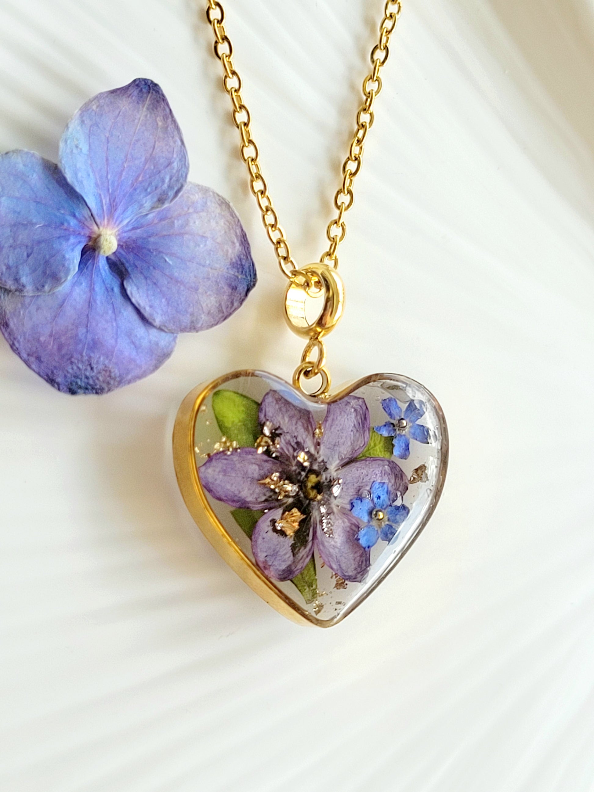 Botanical heart necklace with real genuine lilac. Giftf or her. Handcrafted real flower jewelry